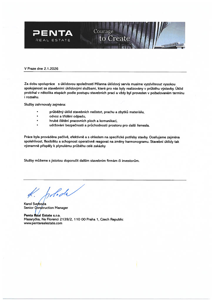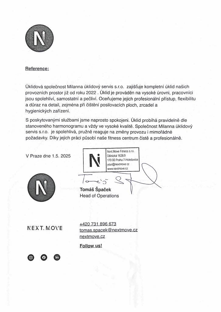 Úklid probíhá večer, máme citlivé prostory a potřebovali jsme diskrétnost. Vše bez problémů, tým je slušný, pečlivý a respektuje pravidla. Oceňuji stabilitu – nechodí pokaždé někdo nový.