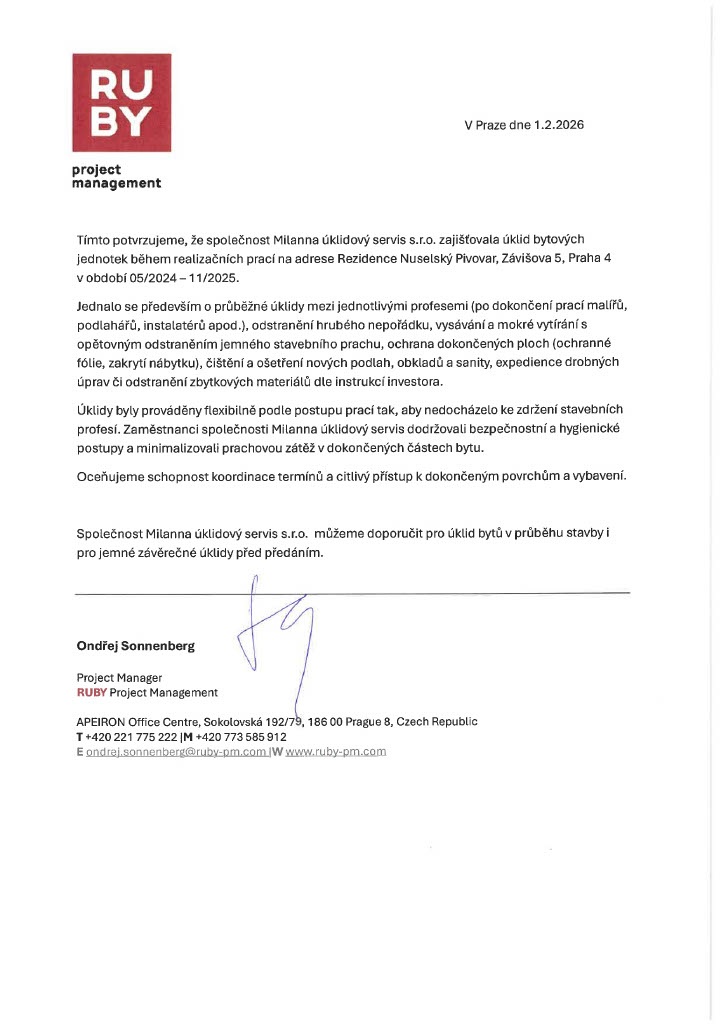 Drobné opravy, malování, údržba – dřív jsme pořád někoho sháněli. Teď zavoláme a věci se řeší. Přístup je profesionální, vše je dohledatelné a termíny se dodržují. Pro nás nejlepší změna za poslední rok.